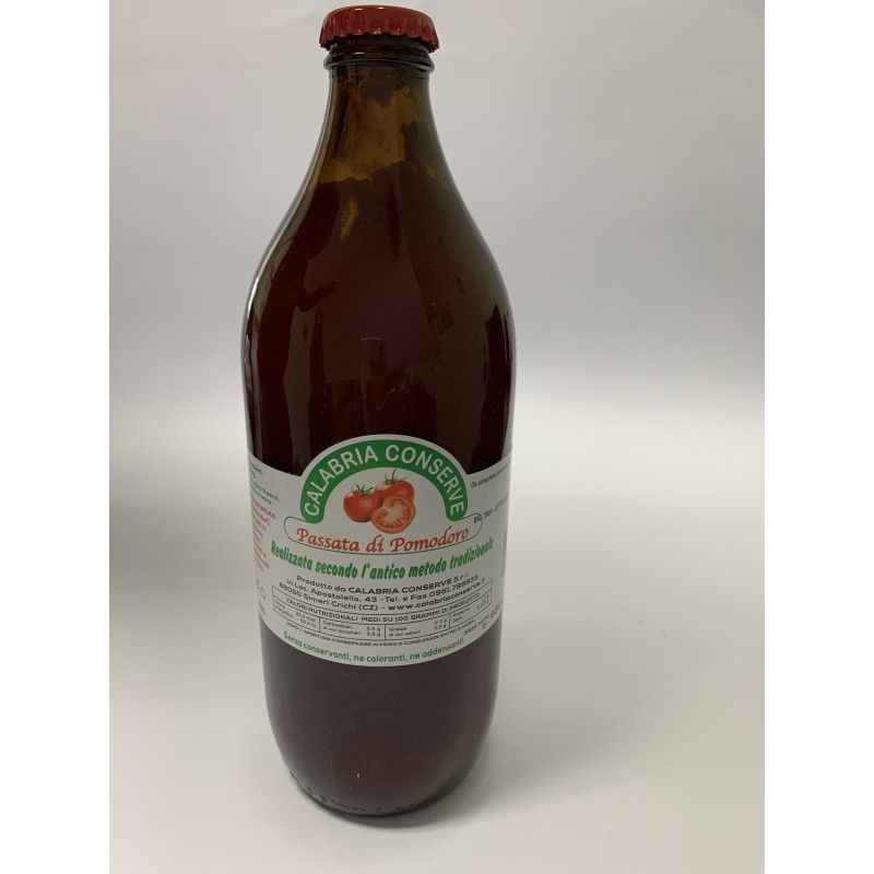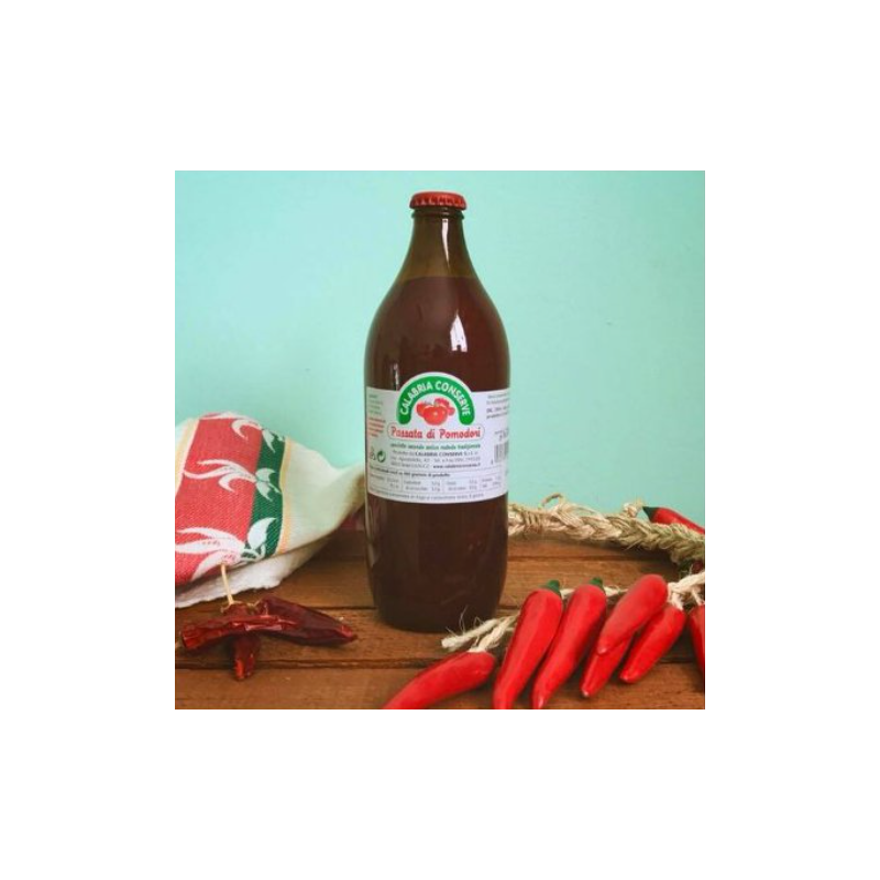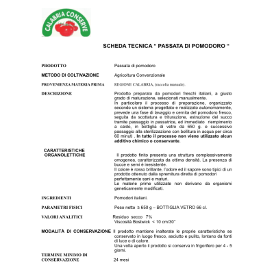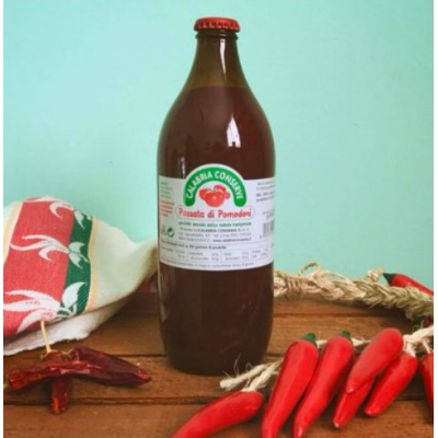 In particolare, il processo di preparazione, organizzato secondo un sistema progettato e realizzato autonomamente, prevede una fase di lavaggio e cernita del pomodoro fresco, seguita da scottatura e triturazione, estrazione del succo tramite passaggio in passatrice ed immediato riempimento a caldo in bottiglia di vetro e successivo passaggio alla sterilizzazione con bollitura in acqua per circa 60 minuti.